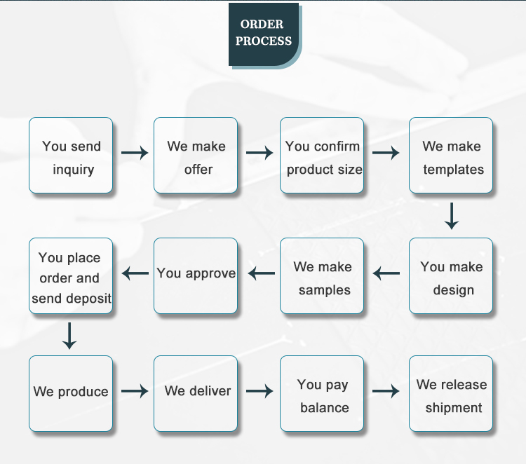 After you paid half in advance and get your artwork then factory make proof freely sent via DHL freely for confirmation. (Before payment our sales will send you Proforma Invoice(P/I)with our payment account. Our payment way is bank transfer/western union. Online payment way like paypal is also accepted for small amount. Our payment mode is 100% advance payment for less than 2000usd. If over than 2000usd then 50% in advance rest paid before shipment.)